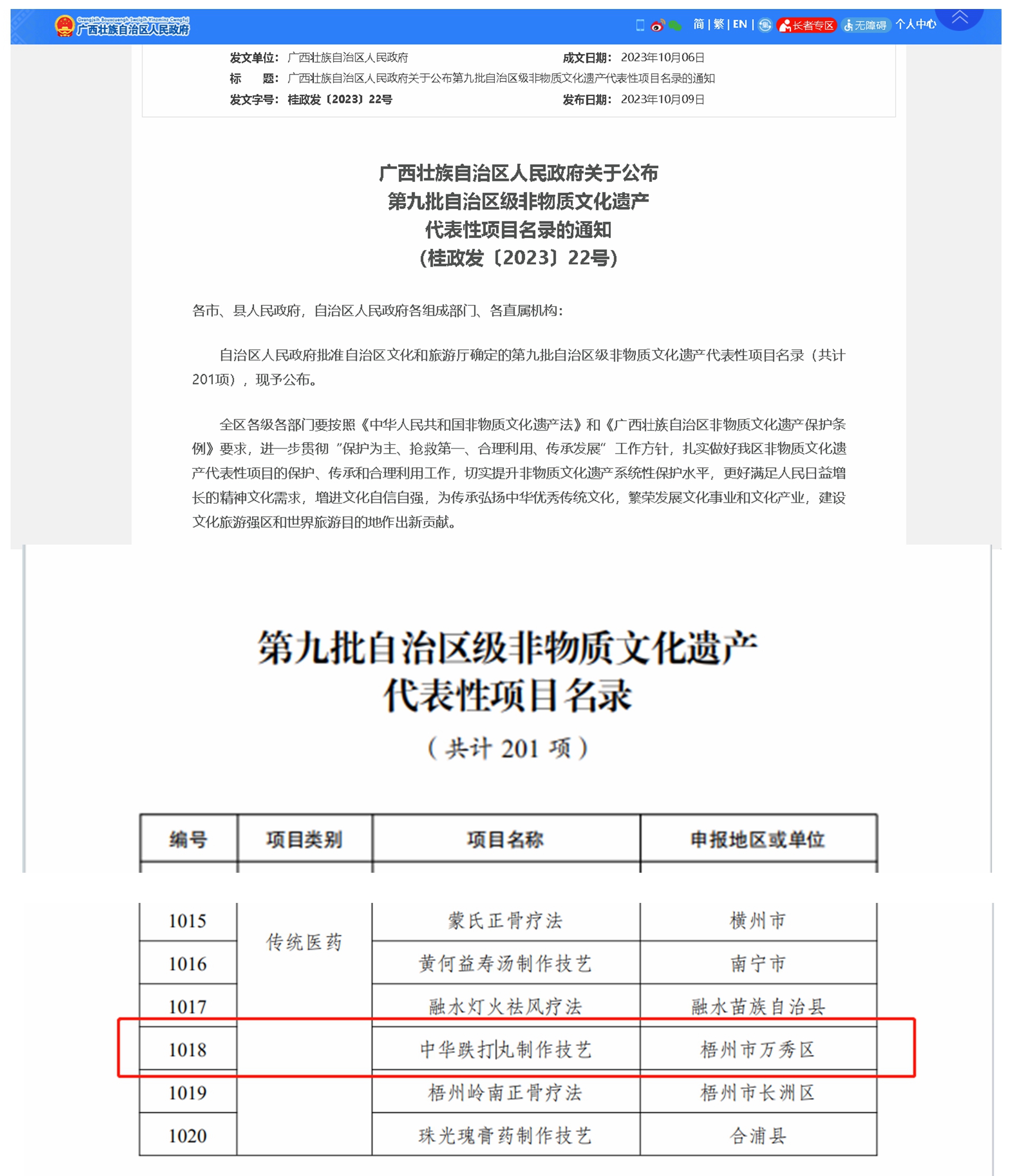 近日,廣西壯族自治區(qū)人民政府公布了第九批自治區(qū)級(jí)非物質(zhì)文化遺產(chǎn)代表性項(xiàng)目名錄,梧州制藥申報(bào)的中華跌打丸制作技藝成功入選,榜上有名。