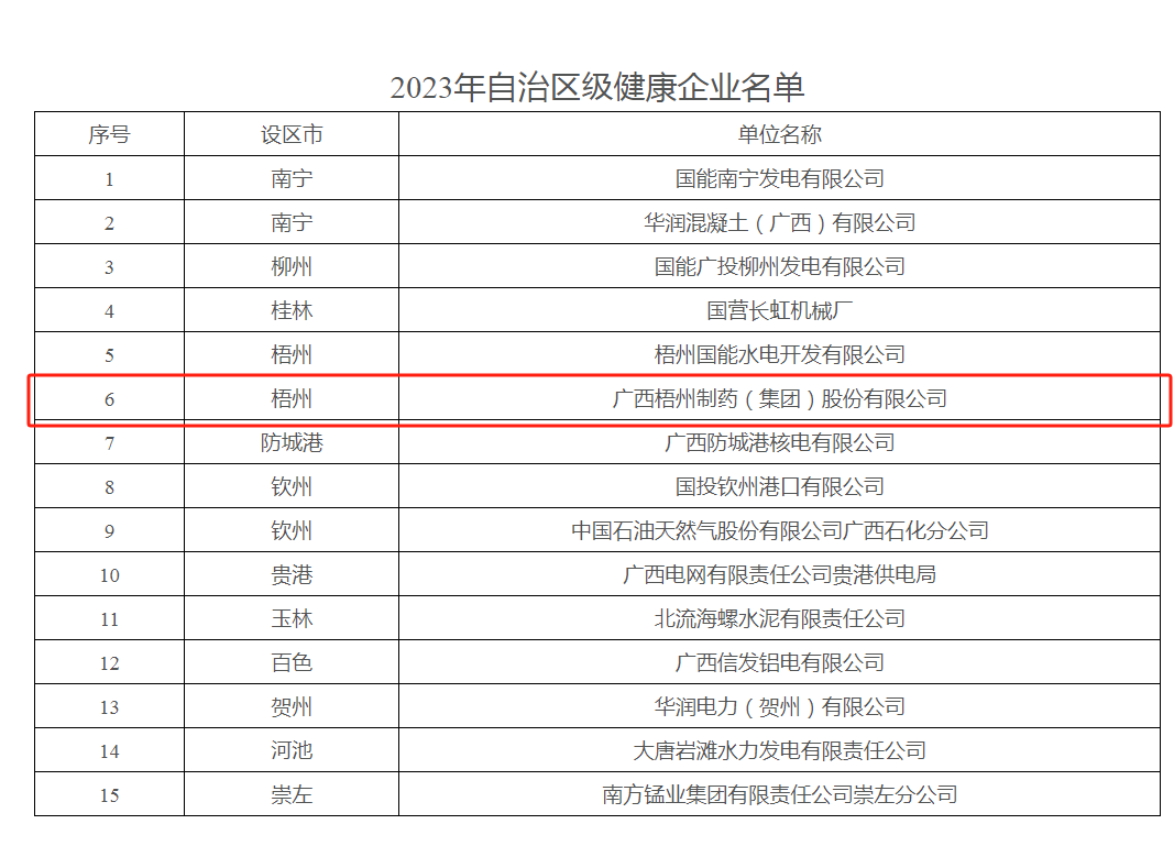 近日,廣西壯族自治區(qū)愛國衛(wèi)生運動委員會印發(fā)《自治區(qū)愛衛(wèi)辦關(guān)于公布2023年自治區(qū)級健康企業(yè)名單的通知》,其中,梧州制藥榜上有名,獲評“自治區(qū)級健康企業(yè)”稱號。