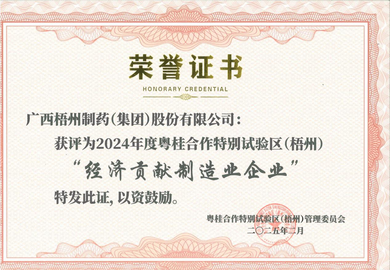 近日,粵桂合作特別試驗(yàn)區(qū)(梧州)2025年茶話會(huì)隆重舉行。茶話會(huì)上,粵桂合作特別試驗(yàn)區(qū)(梧州)管理委員會(huì)對2024年度園區(qū)內(nèi)的優(yōu)秀企業(yè)進(jìn)行表彰,梧州制藥憑借在制造業(yè)領(lǐng)域的卓越表現(xiàn)和突出貢獻(xiàn),榮獲“2024年度粵桂合作特別試驗(yàn)區(qū)(梧州)十大經(jīng)濟(jì)貢獻(xiàn)制造業(yè)企業(yè)”稱號。