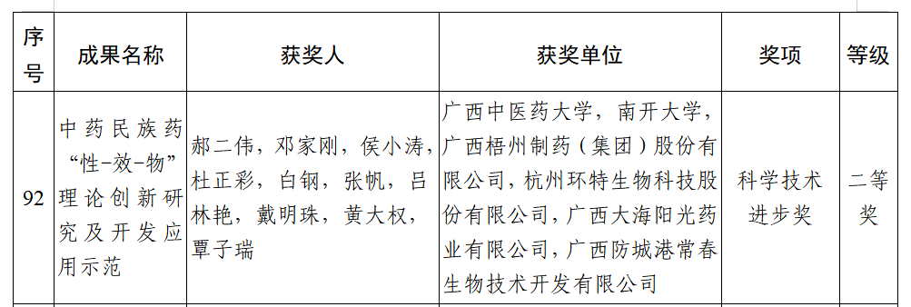 7月4日,2024年度廣西科學(xué)技術(shù)進(jìn)步獎(jiǎng)獲獎(jiǎng)名單正式公布,廣西梧州制藥(集團(tuán))股份有限公司參與的《中藥民族藥“性-效-物”理論創(chuàng)新研究及開發(fā)應(yīng)用示范》項(xiàng)目榮獲廣西科學(xué)技術(shù)進(jìn)步獎(jiǎng)二等獎(jiǎng)。獲獎(jiǎng)項(xiàng)目由大學(xué)院校和企業(yè)聯(lián)合完成,旨在通過創(chuàng)新的理論研究,揭示中藥和民族藥的藥效物質(zhì)基礎(chǔ),提升傳統(tǒng)藥物的現(xiàn)代化水平,梧州制藥作為該項(xiàng)目的第三完成單位,彰顯了其在中藥現(xiàn)代化研究領(lǐng)域的實(shí)力。