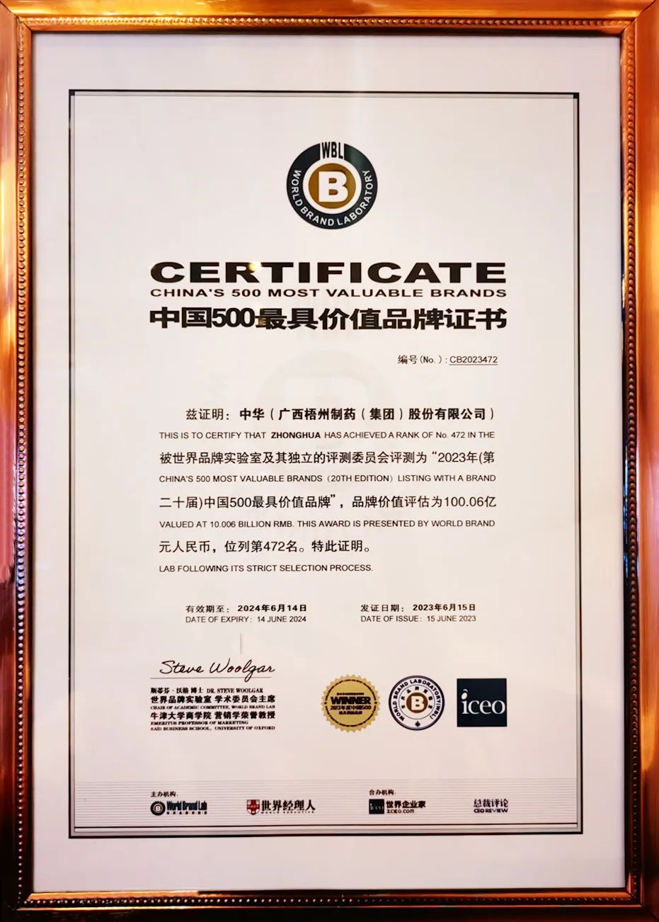 中華跌打丸為梧州制藥獨(dú)家生產(chǎn)品種,自1966年批準(zhǔn)生產(chǎn)至今已經(jīng)臨床應(yīng)用五十余年,先后收錄于2005版、2010版、2015版、2020版、2025版《中國(guó)藥典》,憑借其顯著的消腫止痛、舒筋活絡(luò)、止血生肌、活血祛瘀功效,在骨科治療領(lǐng)域深受認(rèn)可。曾獲國(guó)家醫(yī)藥管理總局優(yōu)質(zhì)產(chǎn)品獎(jiǎng)、中華人民共和國(guó)國(guó)家質(zhì)量獎(jiǎng)銀獎(jiǎng)等榮譽(yù)稱號(hào),核心發(fā)明專利榮獲中國(guó)專利優(yōu)秀獎(jiǎng),廣西發(fā)明創(chuàng)造成果展覽獎(jiǎng)。其產(chǎn)品商標(biāo)是目前我國(guó)醫(yī)藥領(lǐng)域唯一一個(gè)獲準(zhǔn)使用的“中華”商標(biāo),2023年“中華”品牌入選世界品牌實(shí)驗(yàn)室發(fā)布的“中國(guó)500最具價(jià)值品牌”榜單,品牌價(jià)值評(píng)估超100億元,為當(dāng)年度廣西唯一入選該榜單的醫(yī)藥品牌。