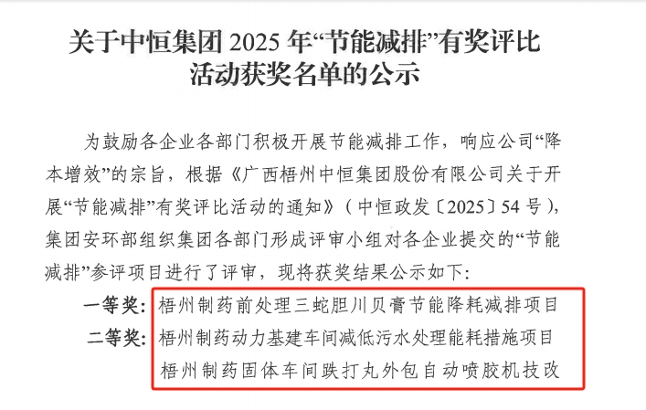 近日,在中恒集團“節(jié)能減排”2025年有獎評比活動中,梧州制藥多項目脫穎而出,包攬一、二、三等獎。其中,前處理車間三蛇膽川貝膏節(jié)能降耗減排項目獲一等獎;動力基建車間減低污水處理能耗措施項目、固體車間跌打丸外包自動噴膠機技改項目獲二等獎;原料藥車間熒光素鈉生產線反應室通風系統(tǒng)及地面整改項目、液體車間減排綜合項目獲三等獎。