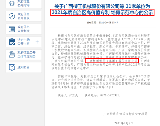 近期,廣西壯族自治區(qū)市場(chǎng)監(jiān)督管理局發(fā)布關(guān)于2021年度自治區(qū)高價(jià)值專(zhuān)利培育示范中心的公示名單,梧州制藥被確定為2021年度自治區(qū)高價(jià)值專(zhuān)利培育示范中心。建設(shè)高價(jià)值專(zhuān)利培育示范中心,
